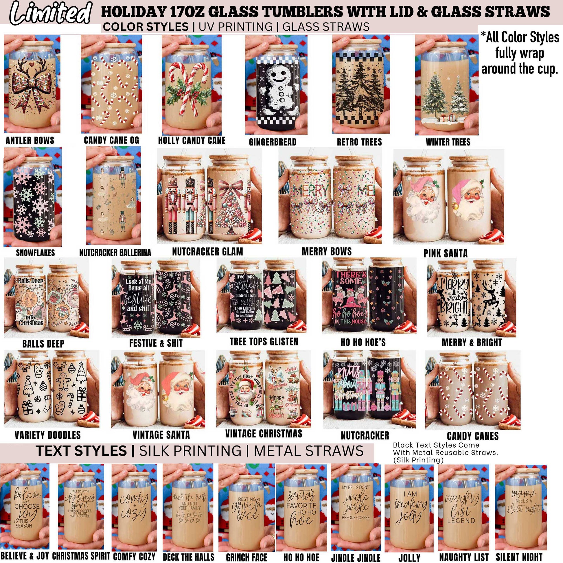 NEW Christmas Designs Released for this season! All customers love our glass mugs. Due to the many ways to use them and stylish yet humorous sayings on them! Use with the top or remove the top and drink without! Cups Incl: Bamboo Lid, Reusable Straw, & Straw Cleaner Our glasses with bamboo tops. Drink it with the top and straw of choice, remove the bamboo lid and drink straight from the glass. Whether it's hot coffee, iced coffee, tea, beer, shakes, mixed drinks or a party - these glasses cover all bases! Details: High Borosilicate Glass Cup Heat Resistant + Lead Free Approx 500ml | 17oz Stainless Steel Straws Keeps liquids cold/hot 8+ hours Care: Dishwasher Safe Bamboo lid - hand wash, do not let sit in water Wash Before Use + Avoid Abrasive Cloths When Cleaning Use Caution When Removing From Microwave